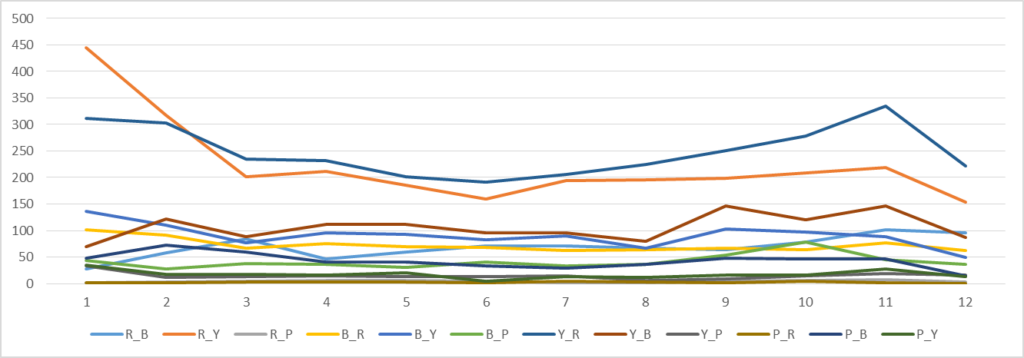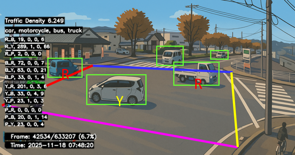 この手法は、複雑な経路解析を必要とせず、効率的に交差点での右左折(例: 赤→青:R_B)や直進(例: 赤→黄:R_Y)といった動きをデータ化できる設計です。最終的に出力されるcrossing_log-*.csvファイルのStartColorとEndColor列には、この方式で判定された移動の始点と終点の色が記録され、交差点における方向別カウントを可能にします。